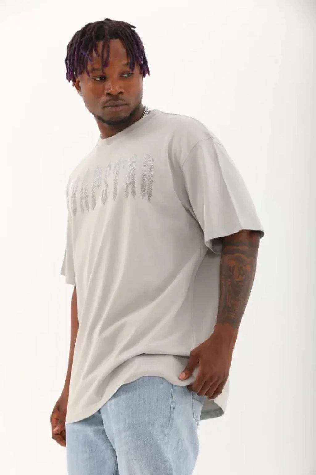 Unisex Oversize Taşlı Bisiklet Yaka T-Shirt - Gri