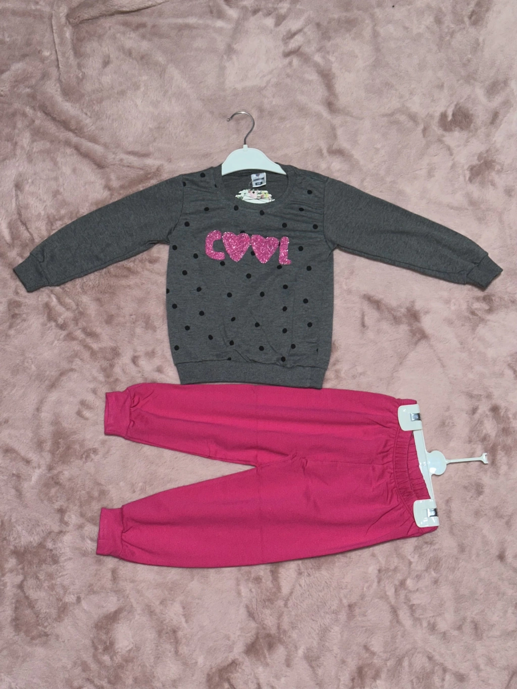 3-7 yaş pontiyeli ikili alt üst takım gri fuşya kız çocuk