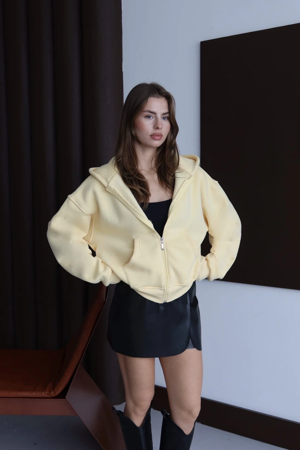 3 iplik şardonlu kapşonlu hoodie frm sarı p510437