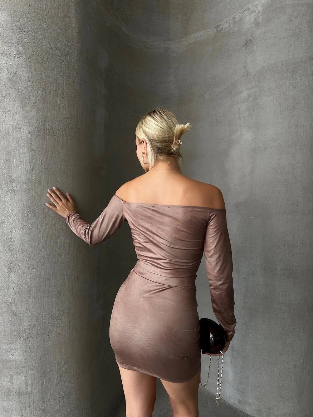 Büzgülü etek bluz takım kahve s24709
