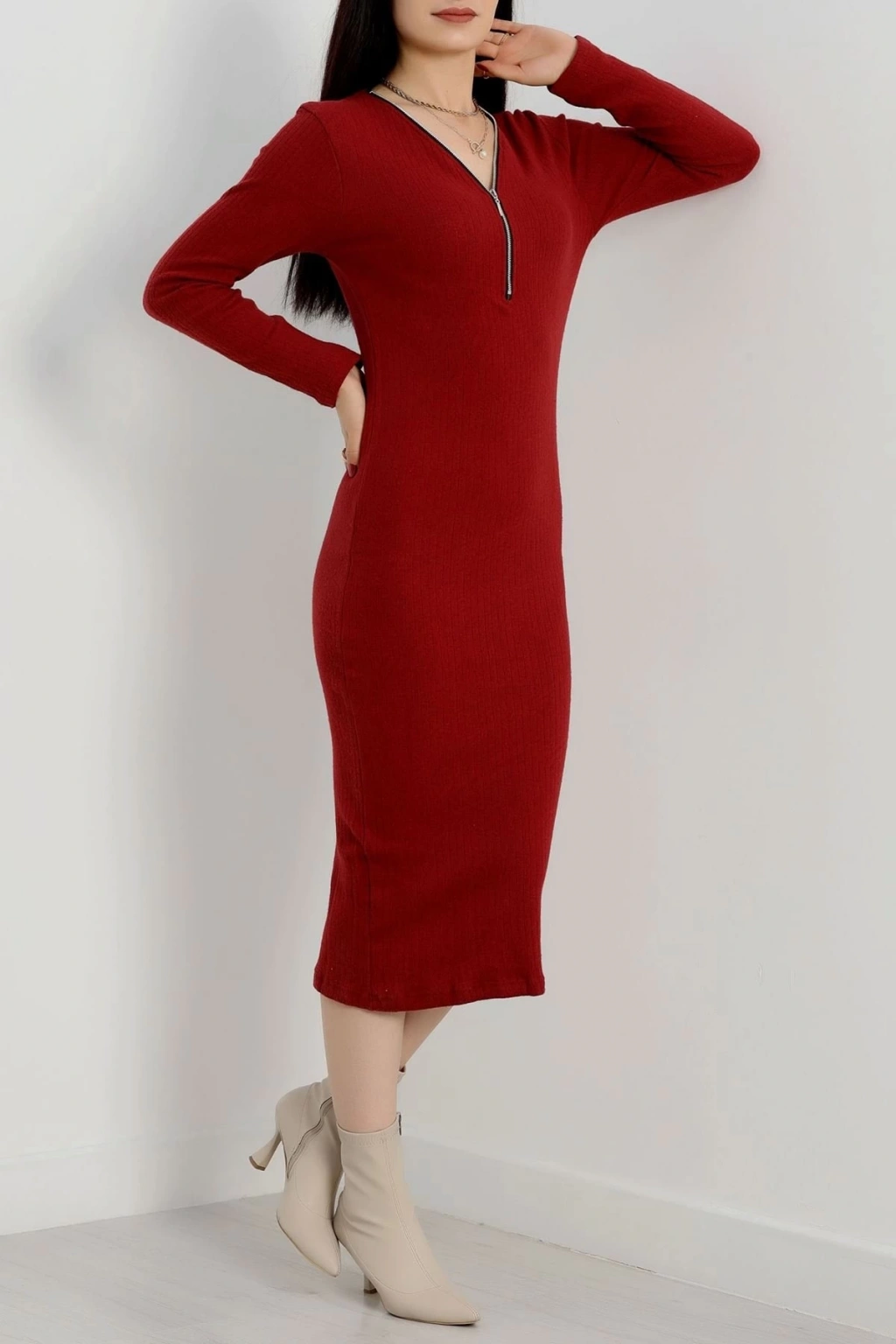 • Fermuar detaylı fitilli şardonlu elbise bordo a3178
