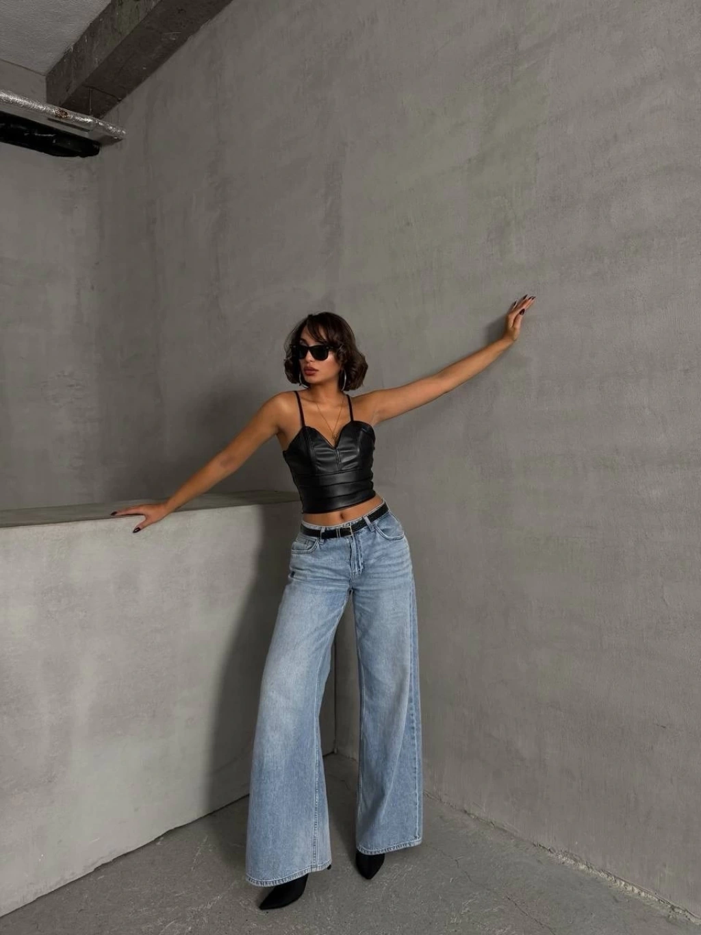 İp askılı yandan fermuarlı rastale deri crop siyah s24113