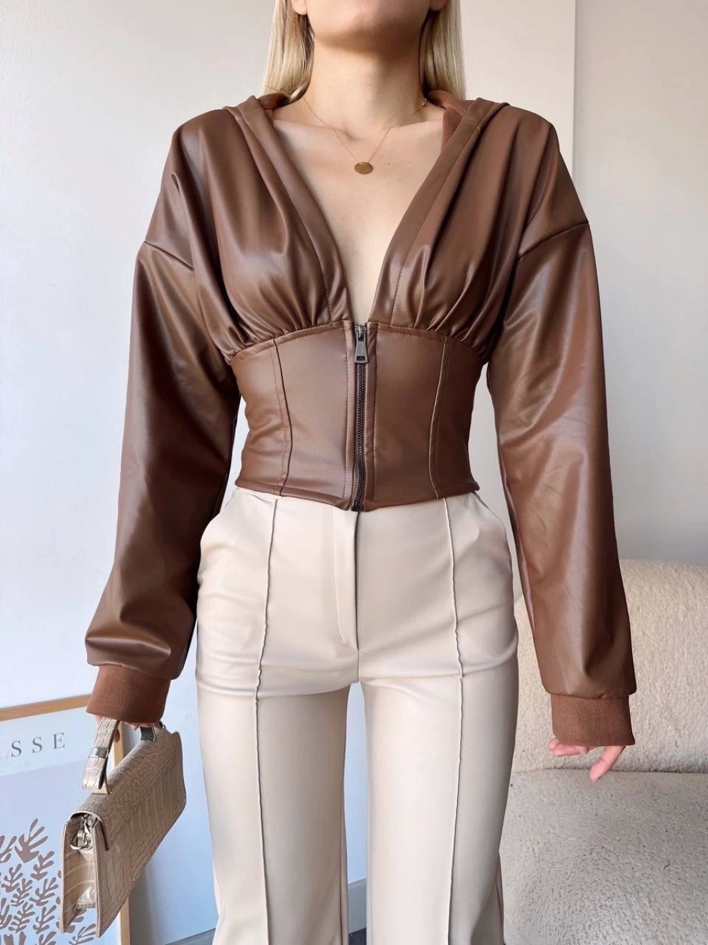 • Kapşonlu yarım fermuarlı ceket kahve h24116
