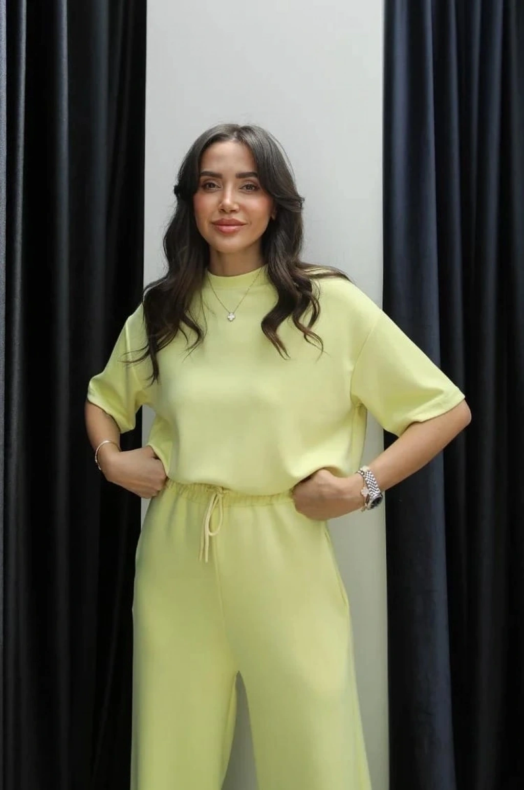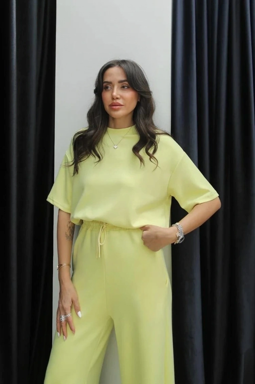 • Alt kısmında yüksek bel şort, üst kısmında ise salaş kesimli oversize tişört bulunmaktadır.