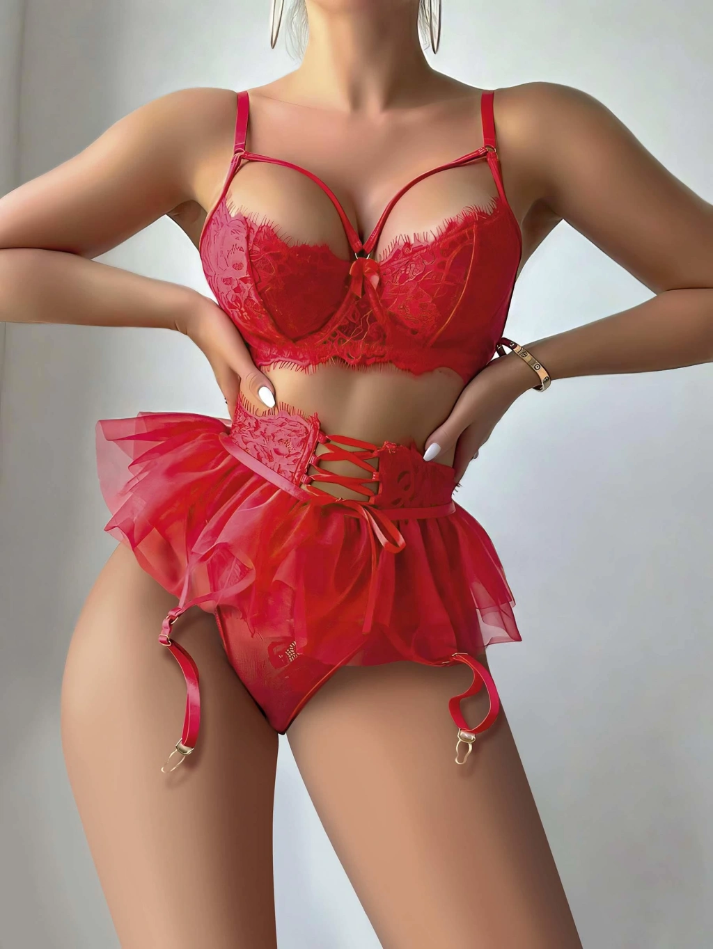 Pembe  dantel tasarımıyla tatlı bir konsept sunar. Özel anlar için hem sevimli hem de çekici bir seçimdir.