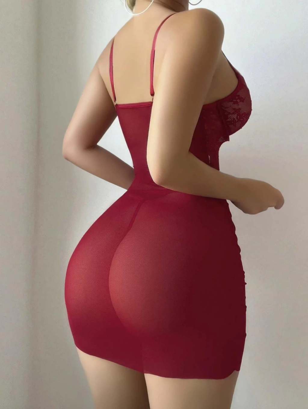 Kadın Kırmızı Fantezi Gecelik Tül Dantel Fiyonk Detaylı Askılı 2209